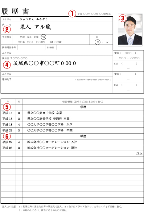 裏側に氏名を書いた3ヵ月以内に撮影した証明写真を、しっかりのりづけして貼ろう。スーツでなくてもOKですが白シャツなど清潔感のある服装を。スナップ写真やプリクラ等は絶対にNG。